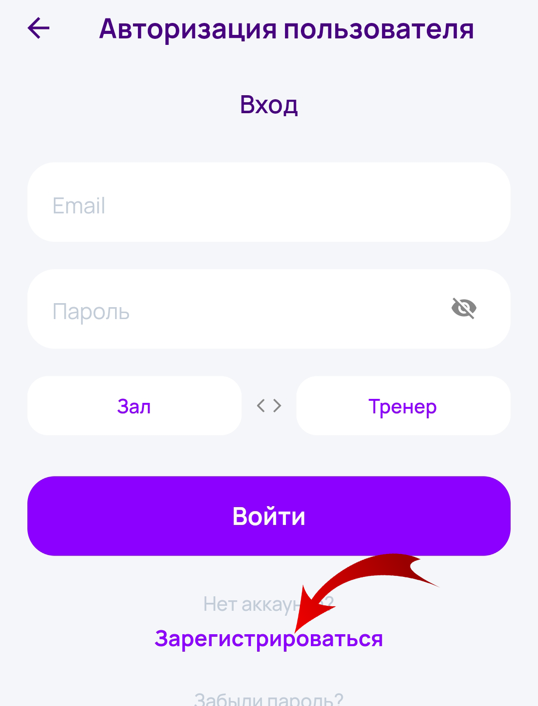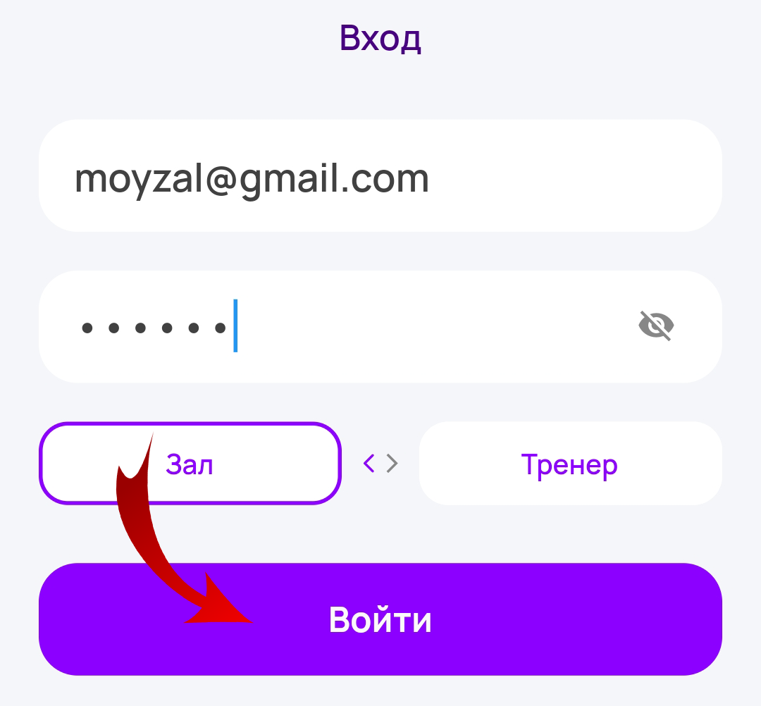 6. Войдите в свой аккаунт используя почту и пароль. Не забудьте выбрать тип аккаунта "Зал"