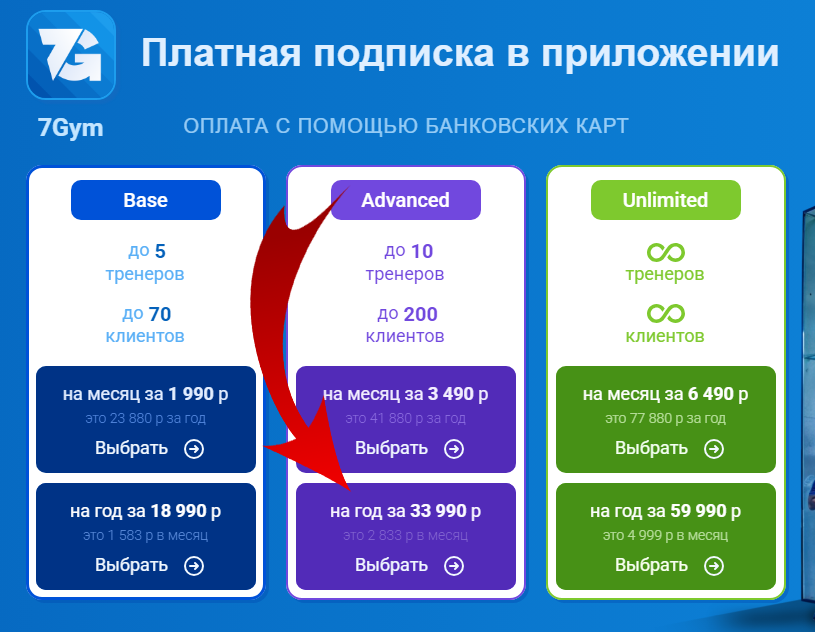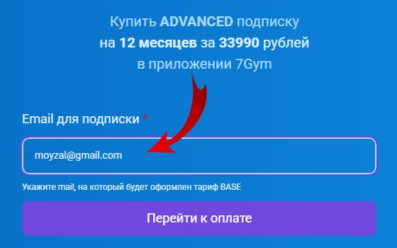 10. В открывшемся окне, сверху будет написан тариф, который вы выбрали. Далее в поле ввода вам надо указать email, на который вы завели аккаунт в приложении 7Gym в пункте 5! Именно на этот email будет привязываться подписка.