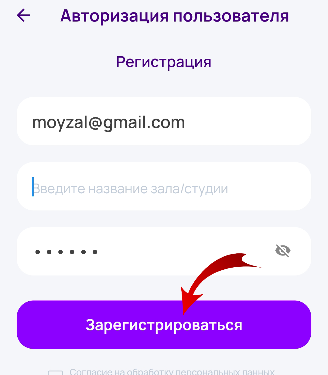 5. Введите действующий email, к которому у вас есть доступ (с помощью этого мэила можно будет восстановить пароль и на него будут приходить чеки о подписках), придумайте и запомните пароль, введите название зала (его будут видеть тренеры) и нажмите "Зарегистрироваться"