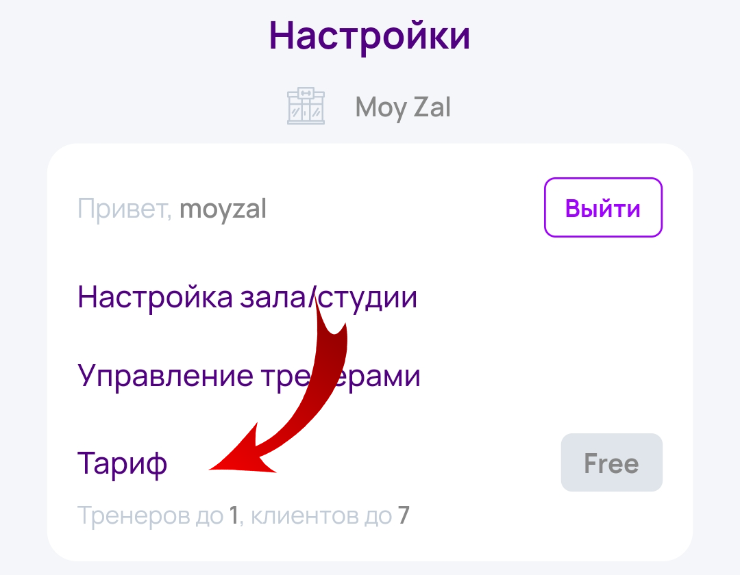 7. Снова откройте меню "Настройки". Если вы успешно авторизовались, вы увидите ваш мэил, название зала и кнопку "Тариф" - нажиме на этот раздел