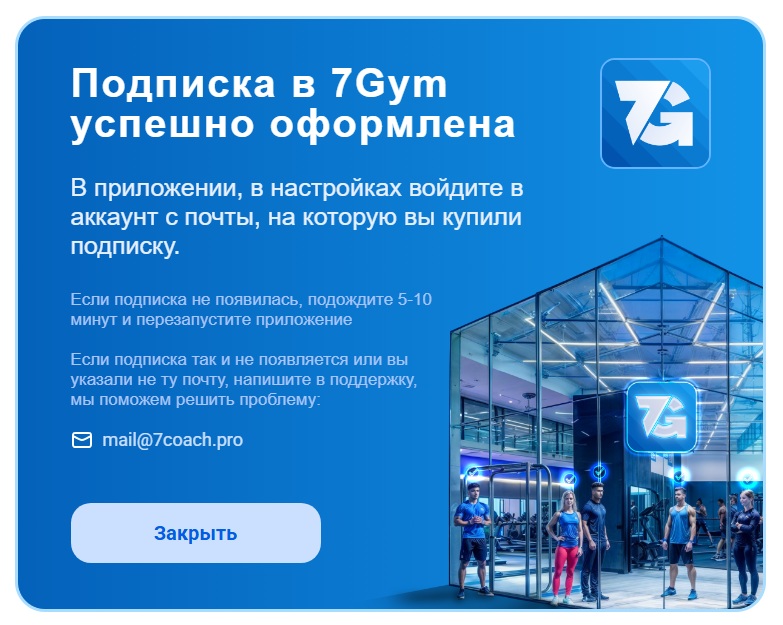 12. В течение 5-10 минут подписка будет активирована на вашем аккаунте в приложении 7Gym. Перезапустите приложение. Если возникли проблемы, напишите нам на почту mail@7coach.pro