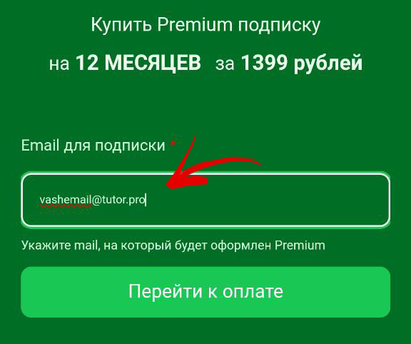 7. В открывшемся окне, в поле ввода вам надо указать email, на который вы завели аккаунт в приложении в пункте 4! Это важно, именно на этот email будет привязываться подписка.