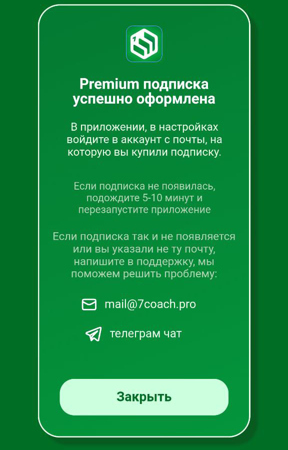 9. В течение 5-10 минут подписка будет активирована на вашем аккаунте в приложении TutorPro. Перезапустите приложение. Если возникли проблемы, напишите нам на почту mail@7coach.pro